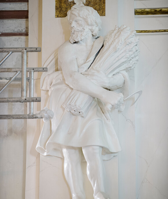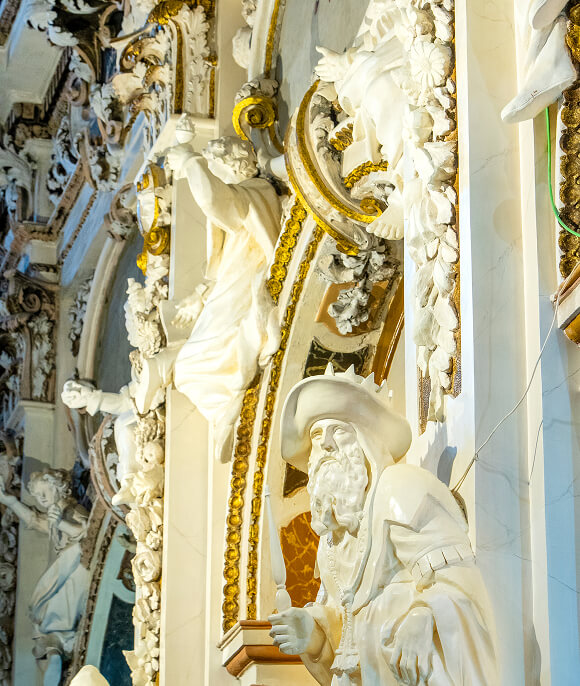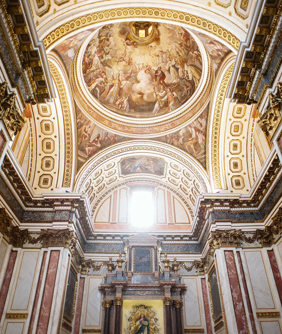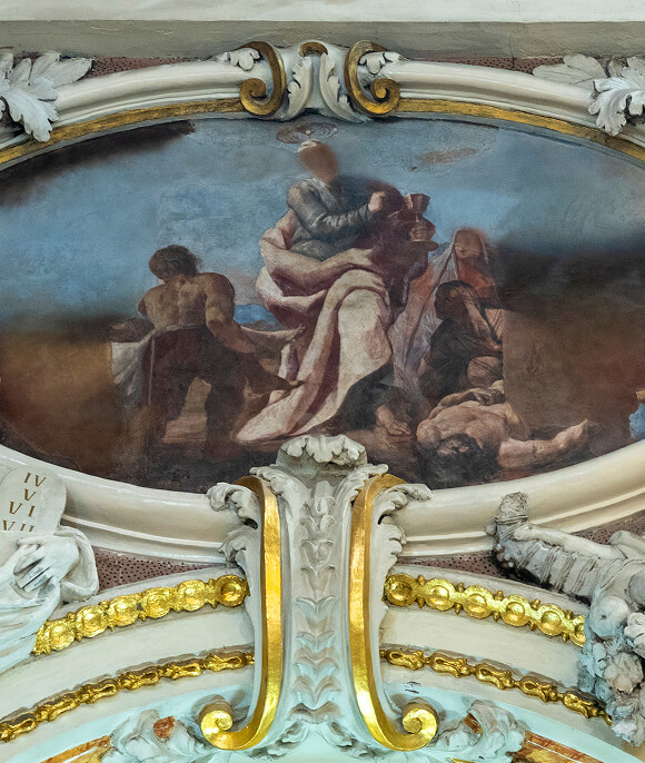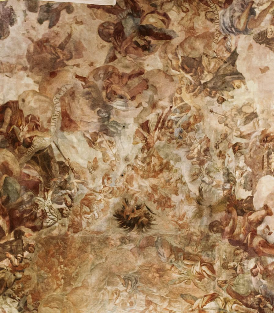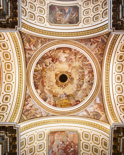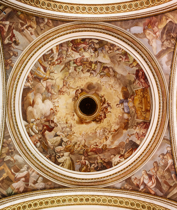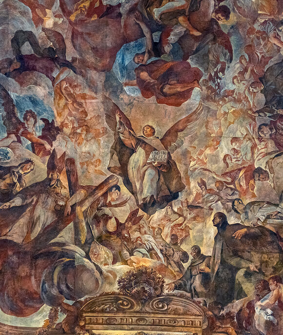 El tercer nivel, la bóveda, eleva la mirada hacia la gloria celestial. Inspirado en el Apocalipsis de San Juan, Palomino representó la Jerusalén Celestial, con Dios Padre en el centro, rodeado de coros de ángeles y santos, presidido por San Vicente Ferrer, el “ángel del Apocalipsis”. En el extremo opuesto, el arcángel San Miguel libra su batalla contra el dragón infernal, mientras la luz y el color envuelven al visitante en una visión de trascendencia.